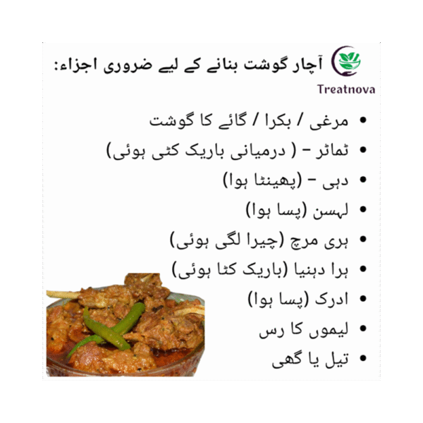 Achar Gosht is a tangy and spicy meat dish inspired by traditional South Asian pickles (achar). It’s made with mutton, beef, or chicken, cooked in a rich gravy flavored with pickling spices like fennel, nigella seeds, and mustard seeds, along with yogurt, garlic, and green chilies. It has a bold, zesty taste and is often served with naan or roti.